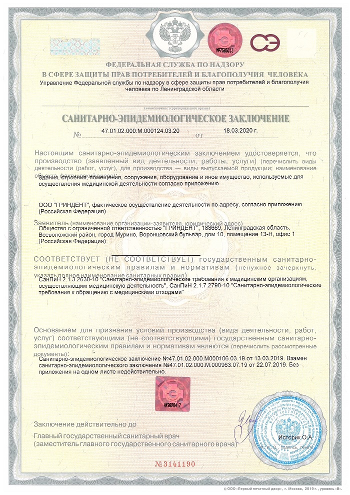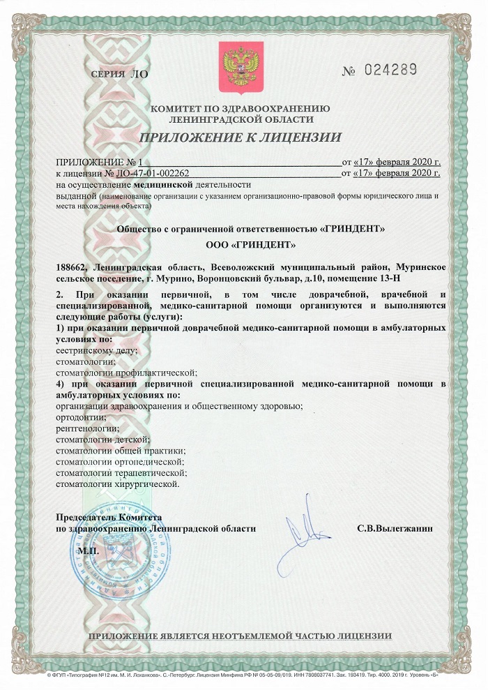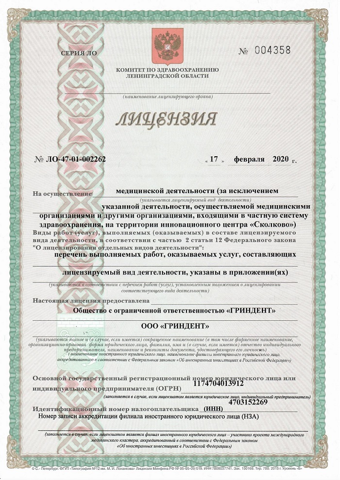 ООО «ГРИНДЕНТ» ИНН 4703152269 ОГРН 1174704013912 Адрес юридический/Фактический: 188662, Лен. Область, Всеволожский район, г. Мурино, бульвар Воронцовский, дом 10, п 13-НО 1 КПП 470301001 Расчетный счет 40702810210000218594 В банке АО «Тинькофф Банк» Кор/счет 30101810145250000974 БИК 044525974 Генеральный директор Амиров Амир Азадиевич Лицензия № ЛО-47-01-002262 от 17 февраля 2020 года